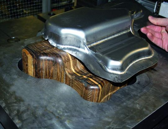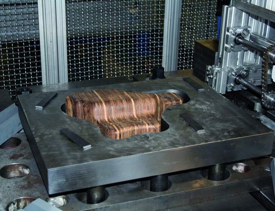 Als erstes Testwerkzeug wurde ein bereits bestehendes Prototypen- und Versuchswerkzeugs gewählt, bei dem der Stahlstempel durch einen aus Robinie gefertigten Stempel substituiert und die Matrize aus Stahl belassen wurde. Als Halbzeuge für die Fertigung des Stempels kamen Blöcke aus orthogonal zu ihrer Faserrichtung angeordneten 4,5 mm dicken Robinienfurnieren zum Einsatz. Hierdurch wurde eine bestmögliche Homogenisierung der mechanischen Eigenschaften erreicht (Bild 3).