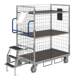 Gitterrückwand, Etagen mit rutschfester Holzauflage, Abrutschsicherung, Schiebebügel, Schreibtafel, Schreibplatte, Drahtschale für Kleinartikel, Leiter, Deichselset, Staplerschlaufen, Rollensatz mit Zentralfeststeller