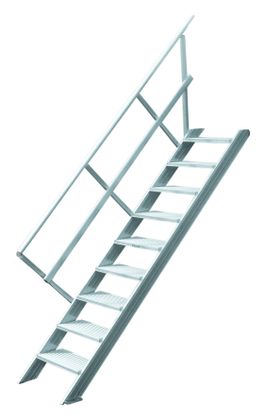 › Alu-Profilstufen 250 mm (bei 45°) / 200 mm (bei 60°) tief, alternativ Alu- oder Stahl-Gitterroststufen 270 mm (bei 45°) / 240 mm (bei 60°) tief gegen Mehrpreis.