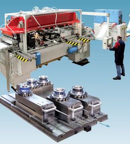 - Alle für die Produktion einer Produktfamilie benötigten Werkzeuge sind auf einem speziellem Schlitten vorbereitet und sind leicht, ohne Werkzeug, montierbar.