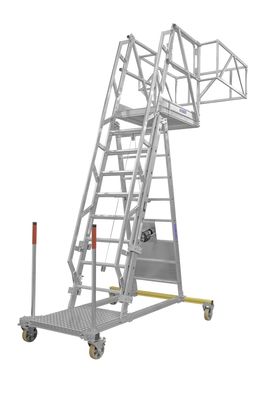 > Fahrbare, höhenverstellbare Podestleiter mit optionalem Schutzkorb und Plattform für Wartungs-, Betankungs-, Enteisungs-, und Reparraturarbeiten.