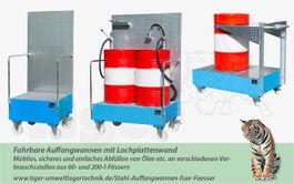 Die ortsveränderliche Auffangwannen sind zur Lagerung von ein bis zwei 60- oder 200 Liter Fässer geeignet. Wannenkonstruktion aus 3 mm Blech, verzinktem Gitterrost, Lenk- und Bockrolle mit Schiebegriff.