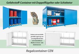 Regalcontainer für die Gefahrstoff-Lagerung, Aufbewahrung von Fässern oder zentralen Lagerung von Vorräten in Großbehältern.